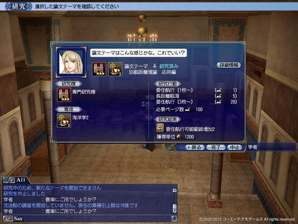 やり方は委任航海、回航許可証を3枚消費する街を選んで出発してすぐ港に戻り…を5回繰り返すと研究達成になるので、達成したら学者に報告してまた同じ研究を受けてを繰り返します。