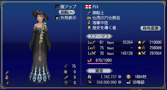 終わったあとのステータス、レベルも1つ上がって、70800冒険経験稼げたかな?
