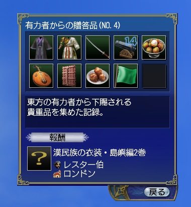 メモリアルアルバムの有力者からの贈答品(NO.4)があと1個で埋まるところだったので、コンプリートさせようと思い立ちました。