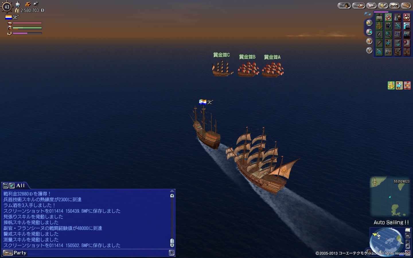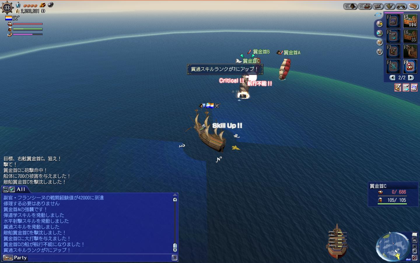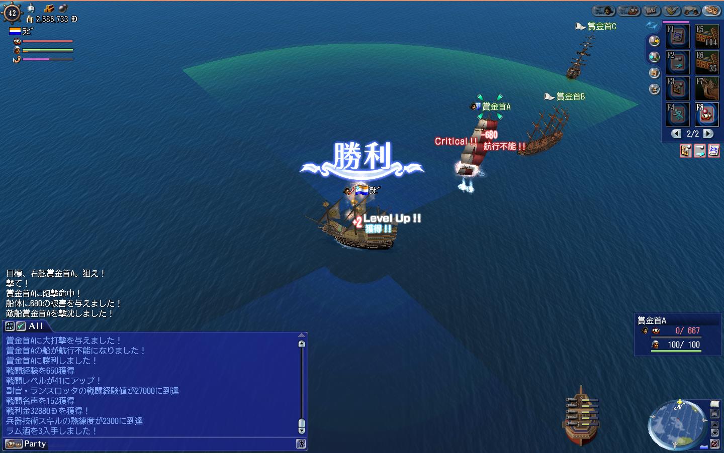 その中でも賞金首はわりとクリティカルを狙いやすく、安平のすぐ南西にうかつに浮かんでるので狩りやすいと思います。