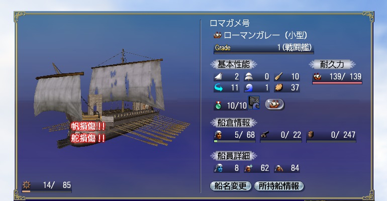 見てくれ、この帆の数値も漕船の数値も極限まで削り落としたローマンガレー、名付けてロマガメ号(^ν^)
