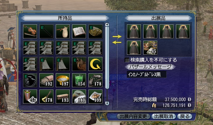 私の売り物は、以前の記事で取り上げたインカノーブルドレス(黒)と、花のヘッドドレスと帆塗料その20、それとおさがりになった副官用の漕運船です。