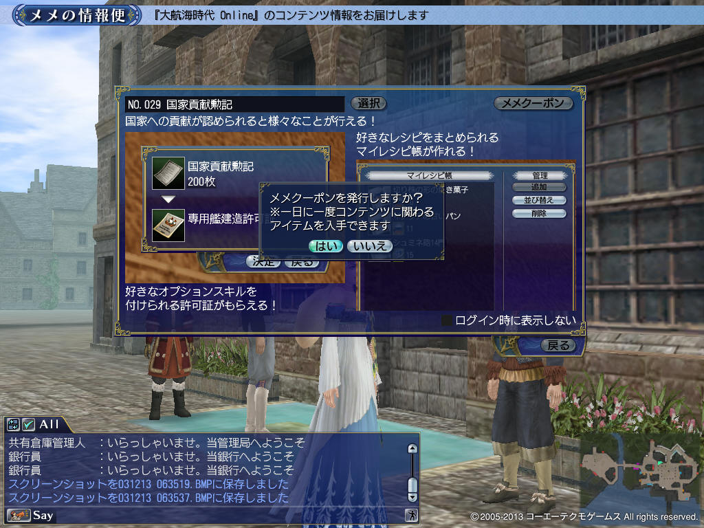 メメクーポンはキャラごとにもらえるから、1アカウントでも2キャラ分、1日2枚集めることができます。