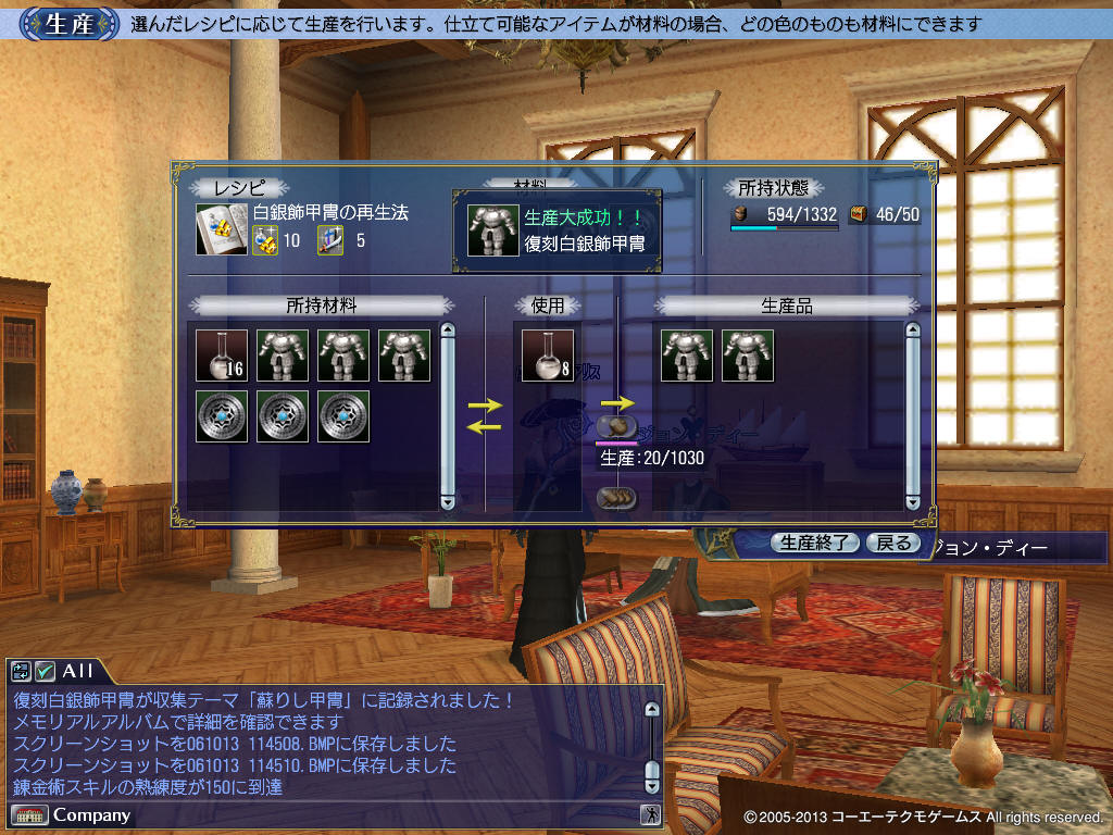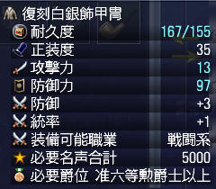 復刻白銀飾甲冑は錬金術の生産で、材料は白銀飾甲冑×1/ 白の錬金薬液×8/ 学者のアミュレット×1、ロンドンのジョン・ディーさんのところで作れます。