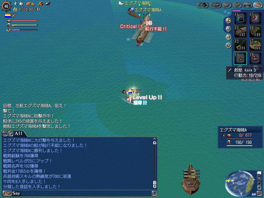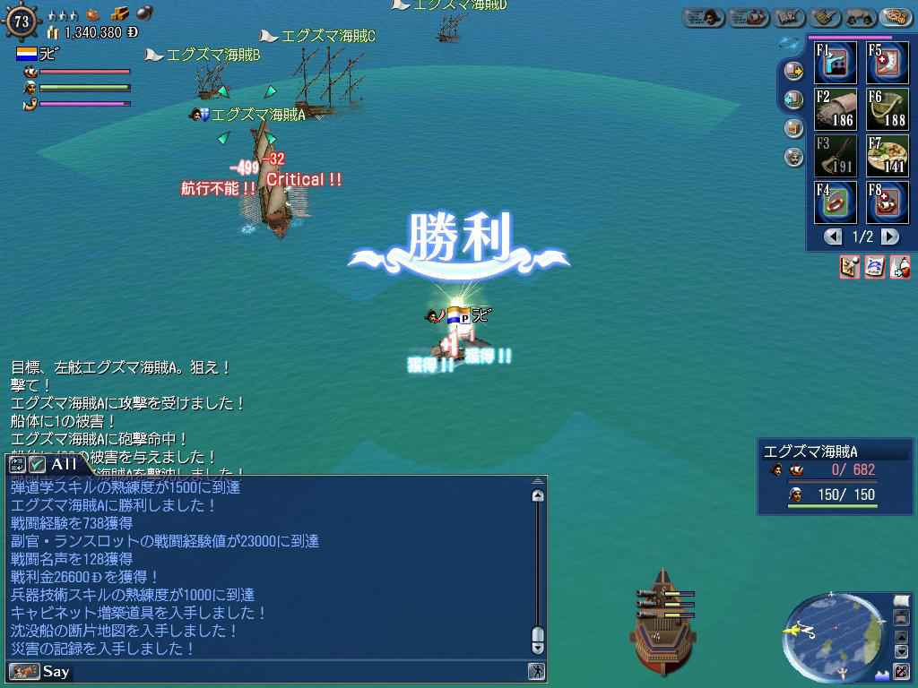 少しレベル上げたかったので、戦闘用記念スループでエグズマ海賊を狩っていたんです。