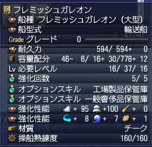 この船は、必要乗船レベルが冒険16/ 交易37/ 戦闘16となっています。
