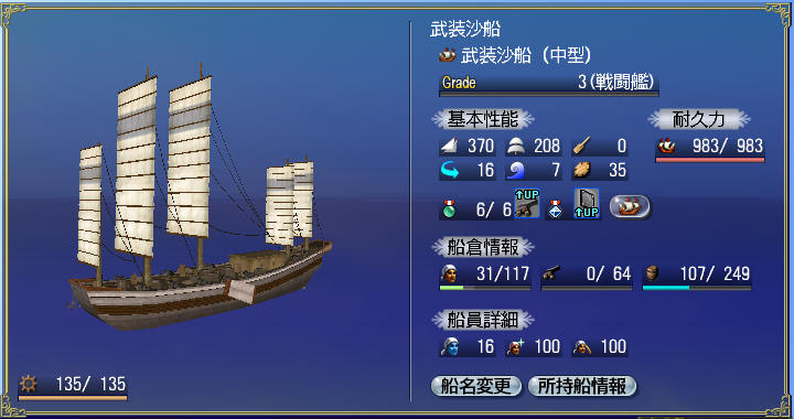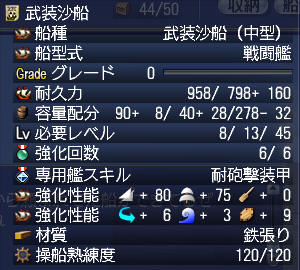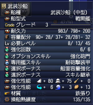 これで中間値は、耐久140 縦・横帆75 旋回6 対波3 装甲7 船室8 砲門24 倉庫-34 になります。