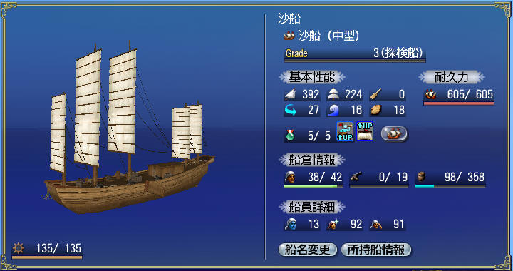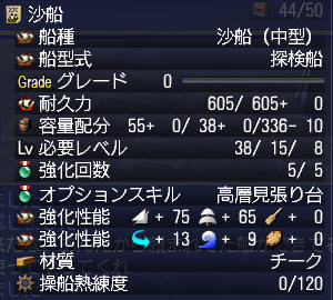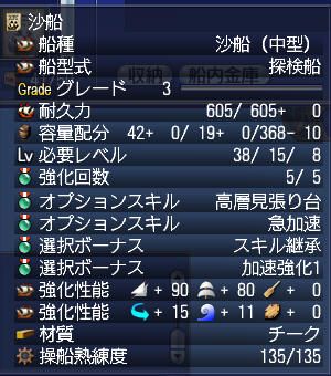 中型で、探検船のままG3まで上げた場合の帆の強化MAXは77、帆の性能強化は15ついてきます。