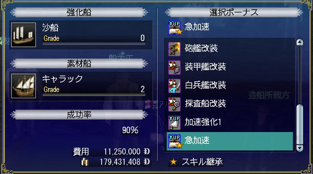 シップリビルドではG1でスキル継承・急加速を、G3で加速強化1をつけました。