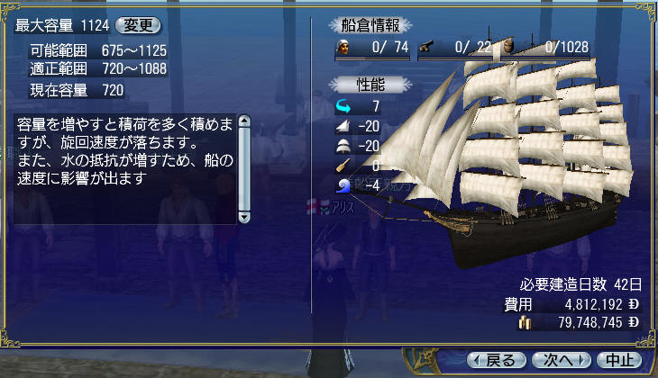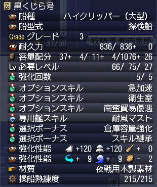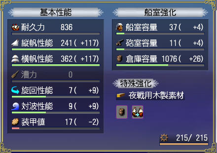 これで期待値は 縦・横帆130/ 旋回8/ 対波11/ 装甲-2/ 船室4/ 砲門4/ 倉庫-2 になります。