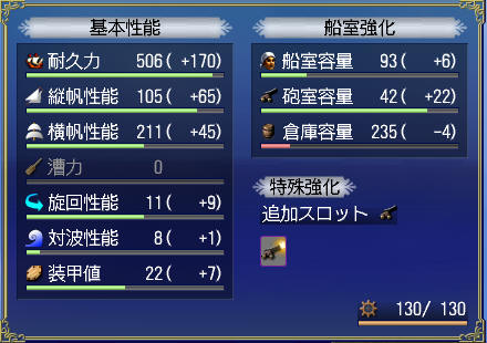 これでFS造船後の期待値は 耐久140/ 縦帆60/ 横帆40/ 旋回6/ 対波1/ 装甲4/ 船室4/ 砲門20/ 倉庫-4 になります。