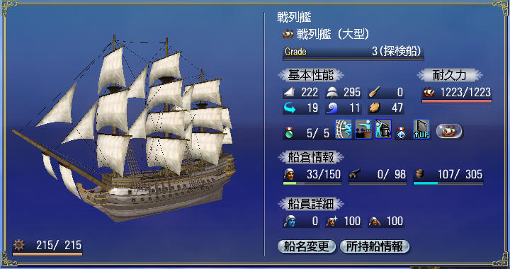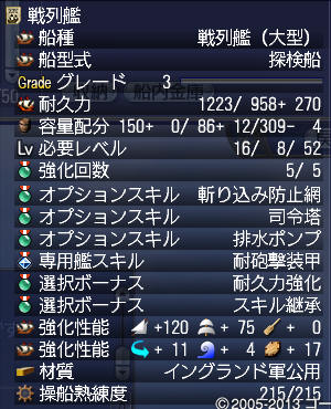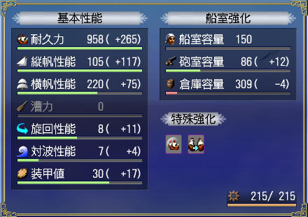 これで期待値は 耐久270/ 縦帆120/ 横帆70/ 旋回10/ 対波4/ 装甲16/ 砲門12/ 倉庫-4になります。