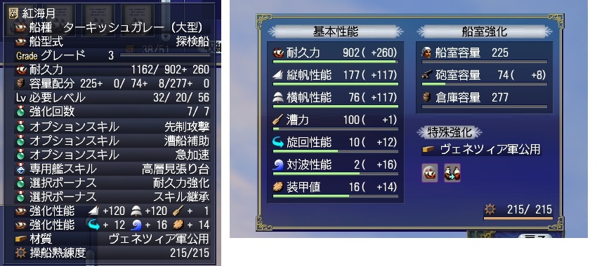 これで最終的な期待値は 耐久+260 帆縦・横+120 漕力+1 旋回+11 対波+16 装甲+13 砲門+8 になるよ。