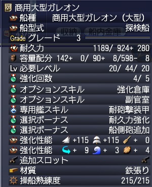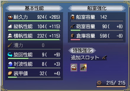最終的な期待値は 縦帆130 縦帆145 旋回10 対波10 装甲-2 船室4 砲室4 船倉36