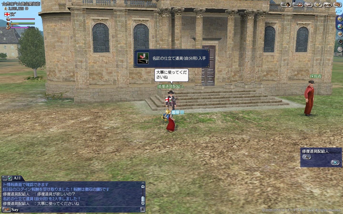 で公会堂R2のところで修復道具配給人が出て、名匠の仕立て道具(自分用)が1日2個もらえるようになり